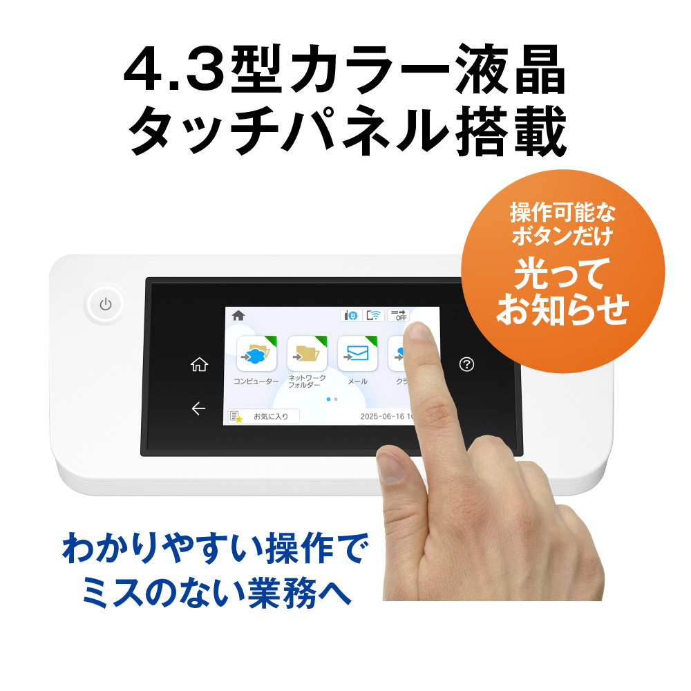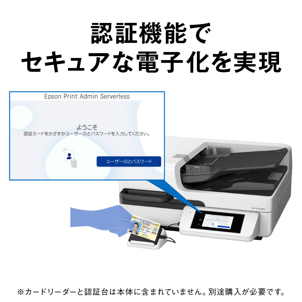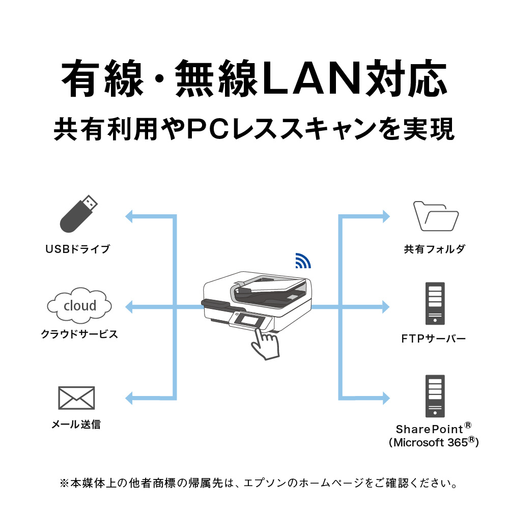 有線/無線LAN標準搭載なので、複数のPCでスキャナーを共有利用したりスマートデバイスからも直接スキャンしたりすることができます。ネットワークを介して指定した宛先にダイレクトにデータ送信・保存できるPCレス機能にも対応、業務効率化に大きく貢献します。さらに、オプションの認証スキャンでセキュアな電子化環境を実現します。
