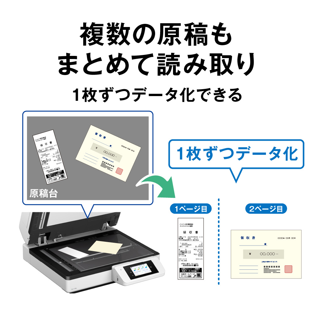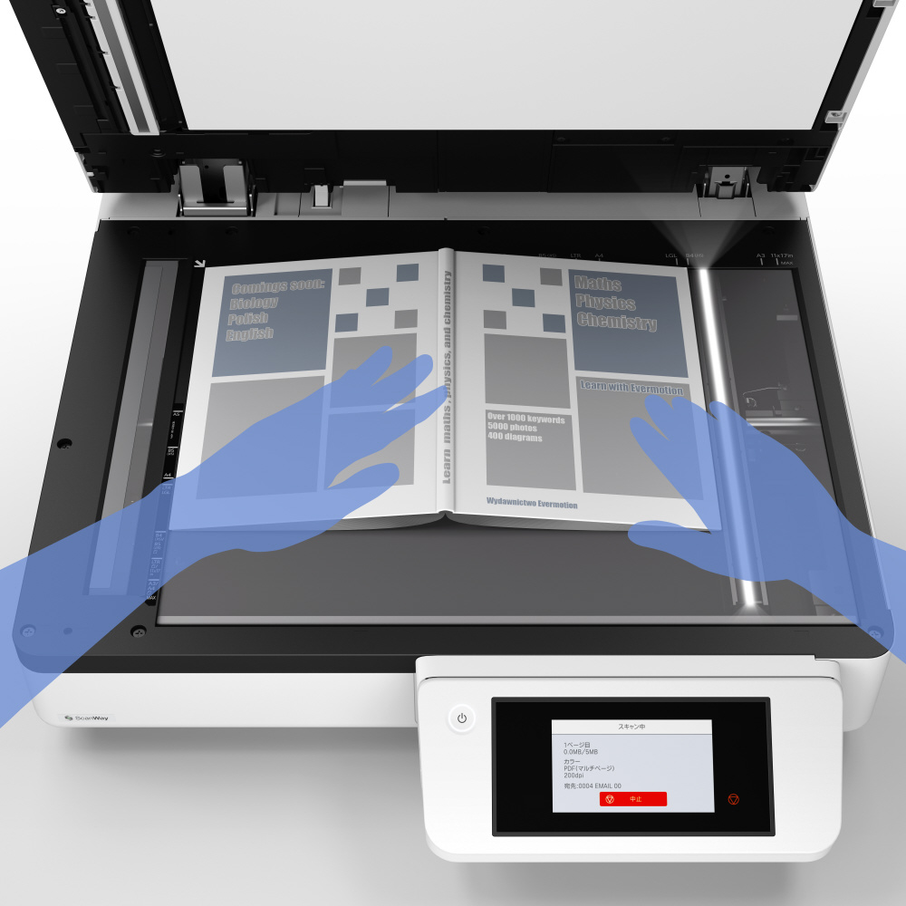 原稿台スキャン機能が大幅に進化し、利便性がさらに向上しました。原稿サイズを自動で認識するほか、複数の小サイズ原稿を同時に読み取り、それぞれを1ページとして自動保存できます。さらに、書籍や冊子のスキャンに便利なブックスキャンモードを搭載、原稿カバーを開けたまま連続でスキャンすることが可能です。