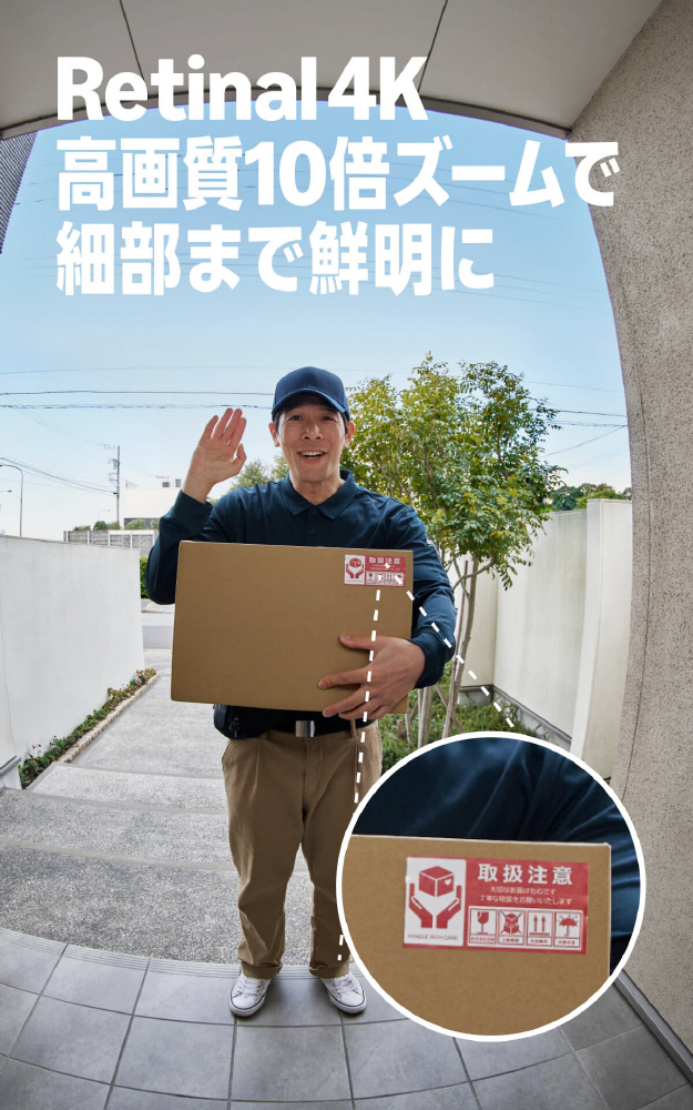 Retinal 4K高画質と10倍ズーム、縦横140°の広い視野角、ナイトビジョンで、玄関先の様子を昼夜問わず驚くほど鮮明に確認できます。