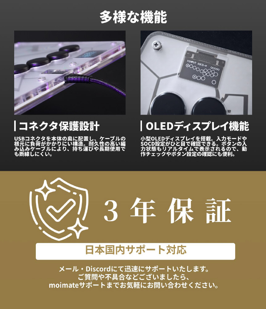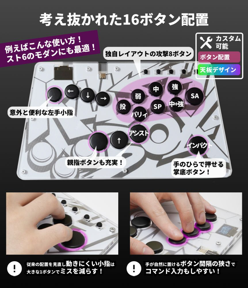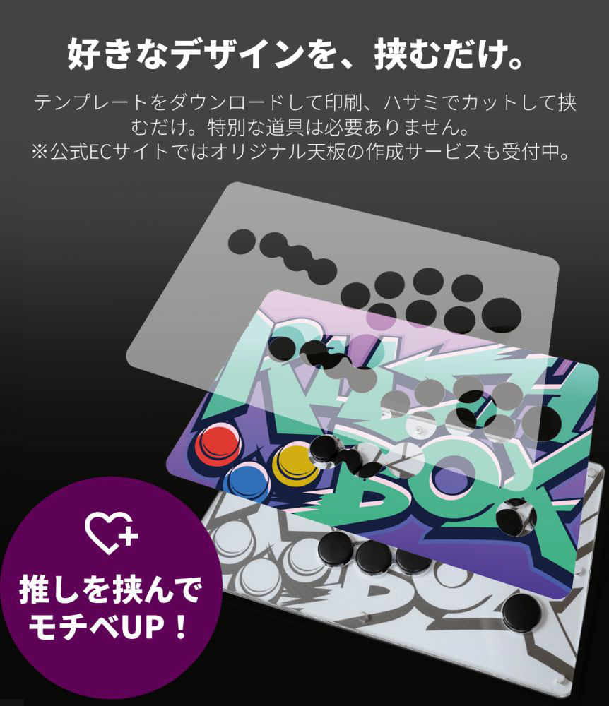 自然な運指でプレイできる独自のボタン配置で、初めてでも自然に操作できるレバーレス。軽いタッチで素早く反応する静音スイッチを搭載し、天面デザインも自分好みにカスタマイズ可能。妥協のないスペックを1万円台で実現しました。