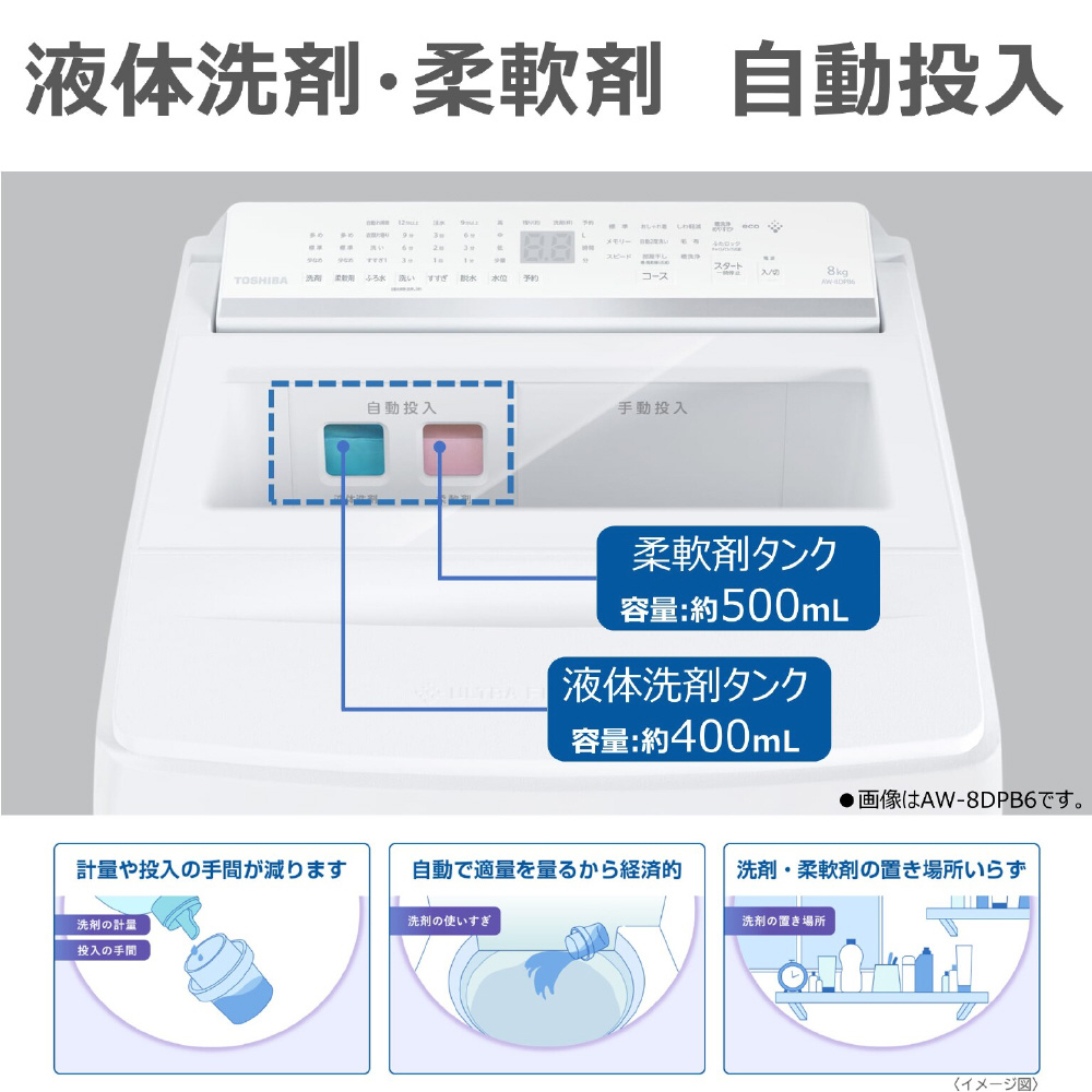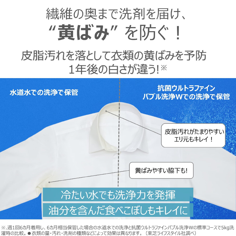 ウルトラファイルバブル洗浄W搭載、驚異の泡で、1年後の白さが違う。さらに洗うたびに抗菌。洗剤、柔軟剤自動投入を搭載し、使いやすさにこだわった「気配り設計」。