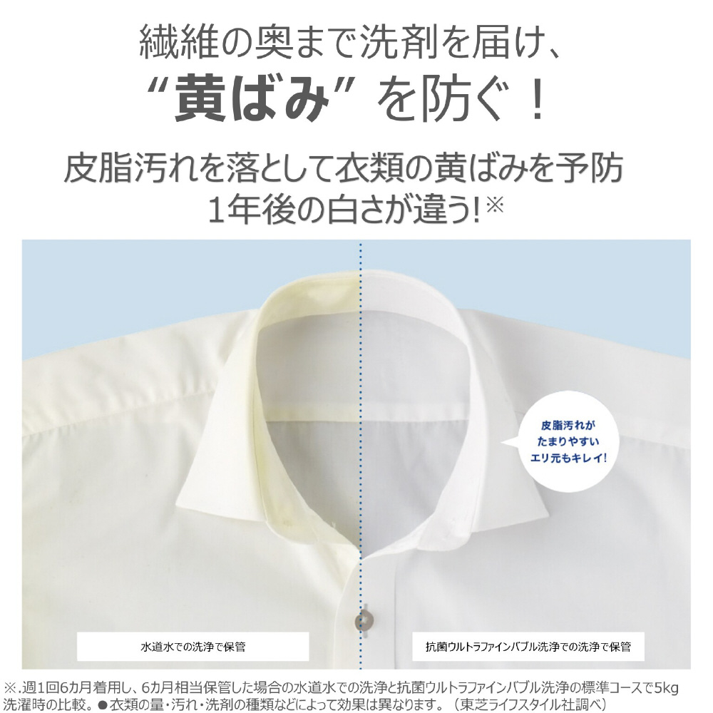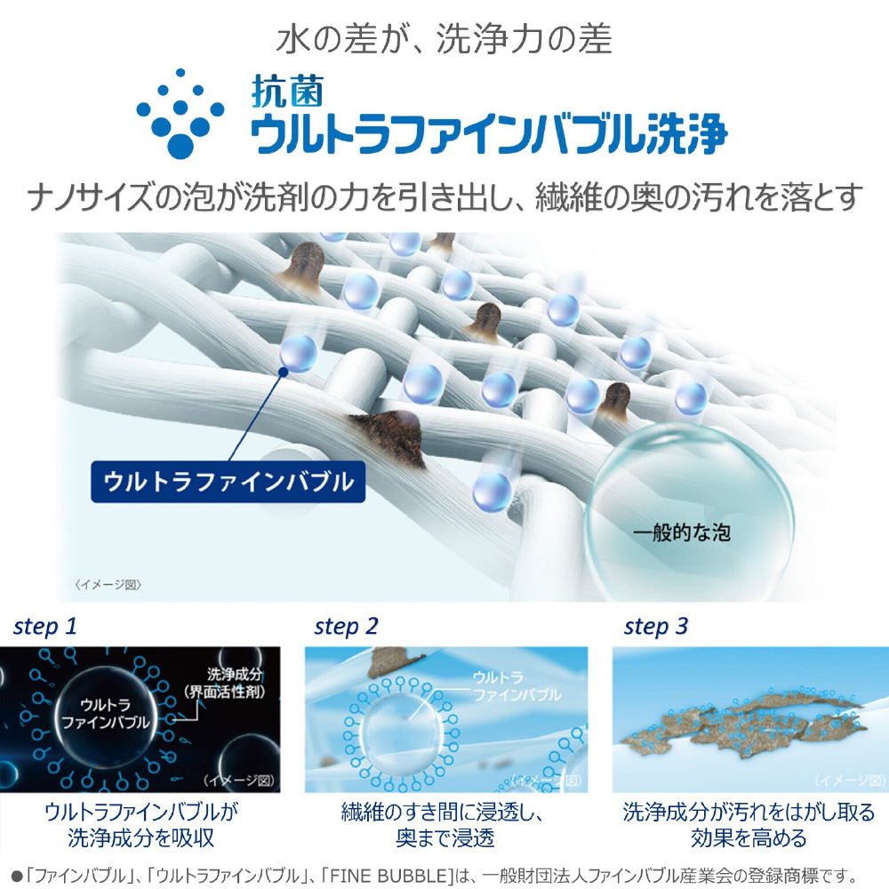 ※1 独自の搭載技術により、洗濯機内部で1マイクロメートル未満のナノサイズの泡「ウルトラファインバブル」を生成し、ウルトラファインバブル水と洗剤を混ぜ合わせた洗濯水により洗濯を行うことで、皮脂汚れに対する洗浄効果を高め、衣類の黄ばみを抑えられる洗浄技術