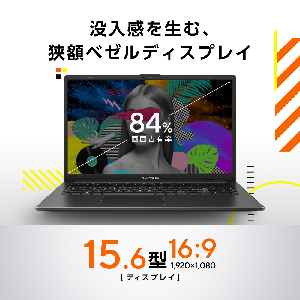 軽量・コンパクトなボディに高い視認性と快適な操作を実現する15.6型の大きなディスプレイを搭載。ノートパソコンにもかかわらず広い作業スペースでマルチタスクも快適に行うことができます。さらに、高い没入感を生み出す狭額ベゼルを採用し、映画やドラマなどの映像コンテンツもよりお楽しみいただけます。