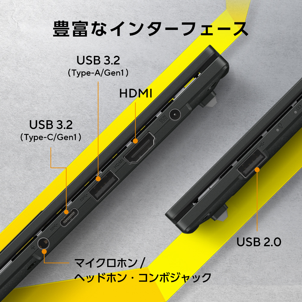 リバーシブルな形状のUSB Type-C(USB3.2/Gen1)をはじめ、従来のUSB Type-A(USB3.2/Gen1)やUSB2.0を搭載し、複数のUSB機器を接続することが可能です。また、外部ディスプレイに接続が可能なHDMIを搭載。より広い作業スペースが必要な場合も、外部ディスプレイに接続することで、作業領域を拡張することができます。