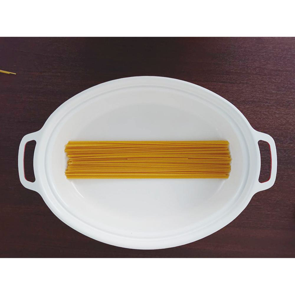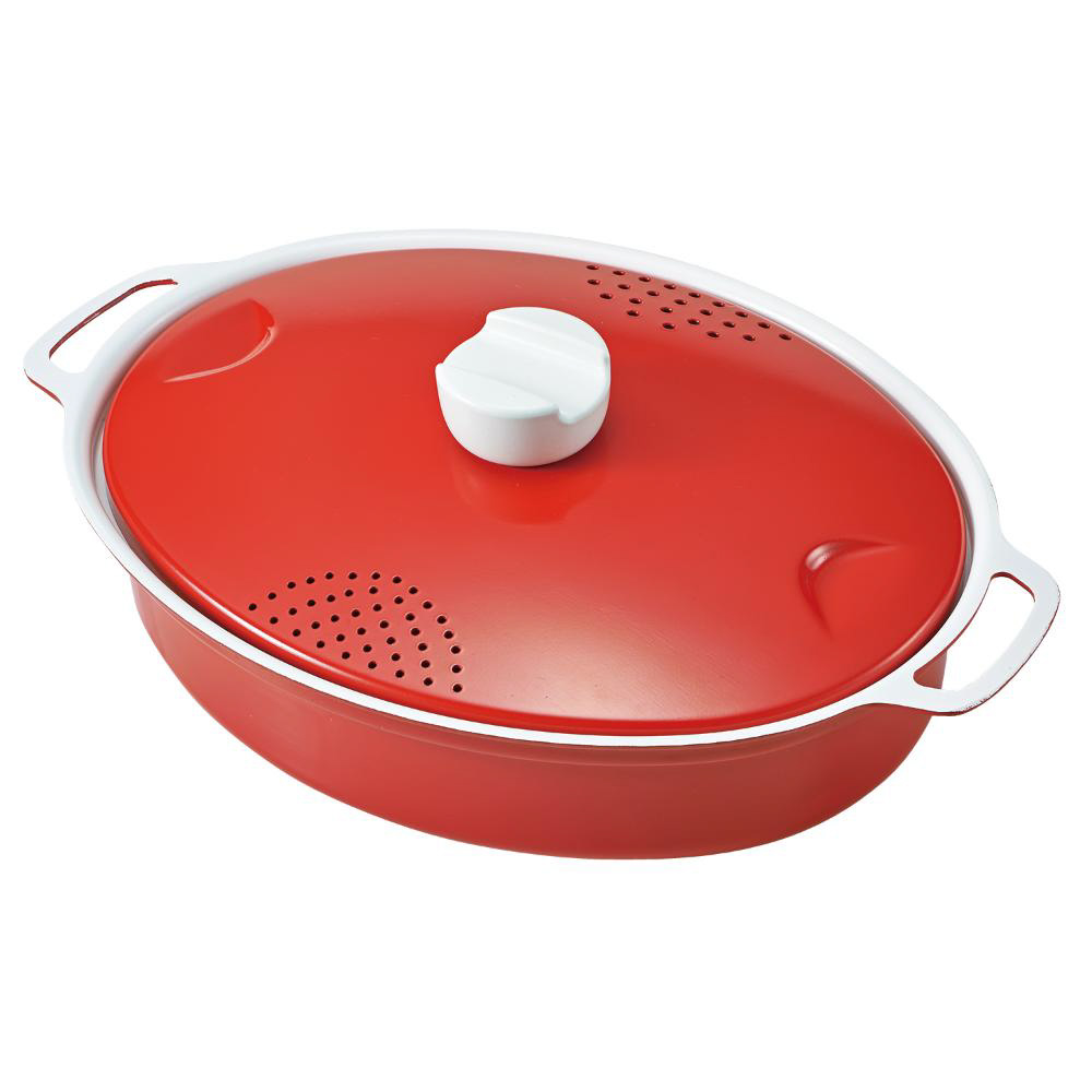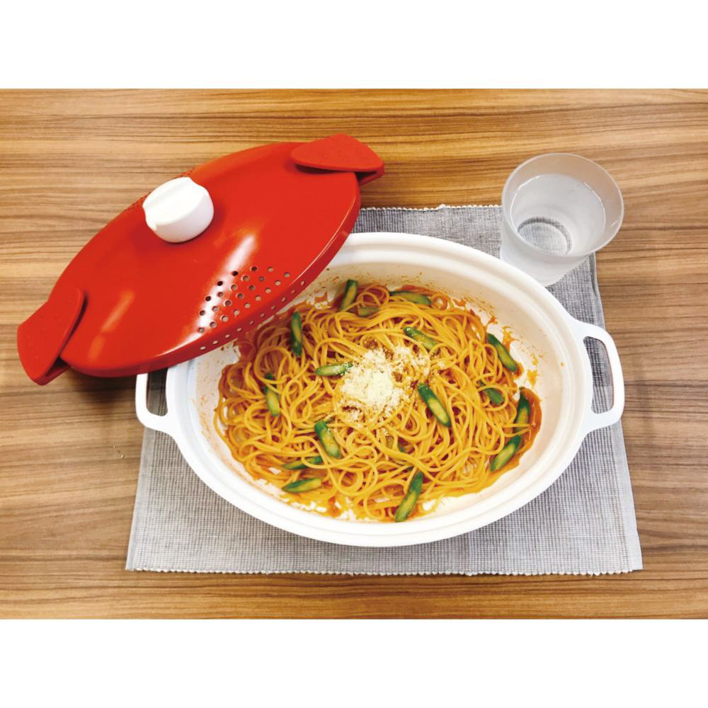 パスタなどを寝かせたまま茹でられる。少ない水で沸騰するので時短調理可能!蓋を付けたまま湯切りができて便利なオーバルパン。