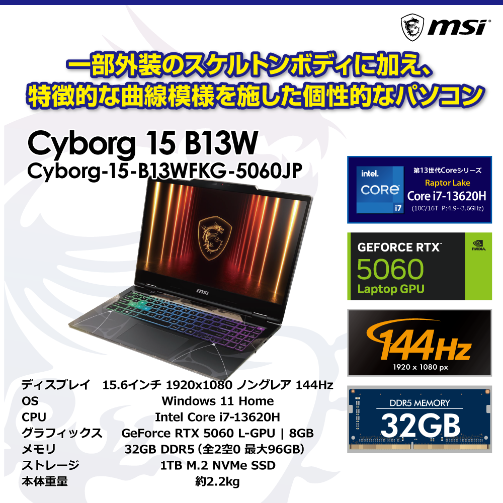 Cyborg-15-B13WFKG-5060JP ゲーミングPC(ノート) MSI オデッセイグレイ & スケルトン [15.6型 /Windows11 Home /intel Core i7 /メモリ:32GB /SSD:1TB /日本語版キーボード /2026年4月モデル] 【864】