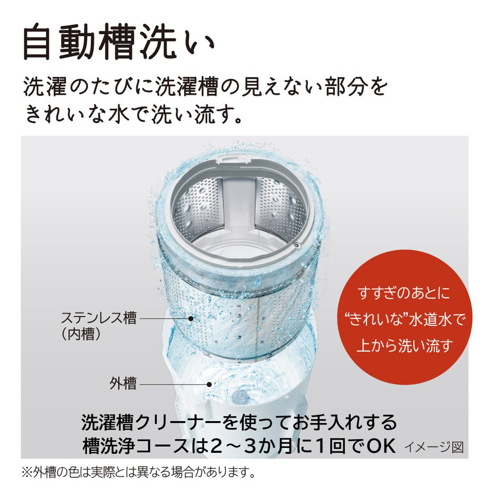 衣類長もち「ナイアガラ ビート洗浄」。槽の見えない部分を洗い流す「自動槽洗い」。半透明でごみが見やすい「糸くずフィルター」。