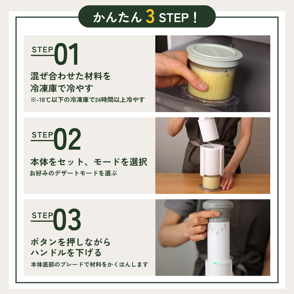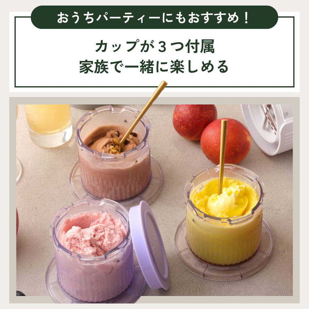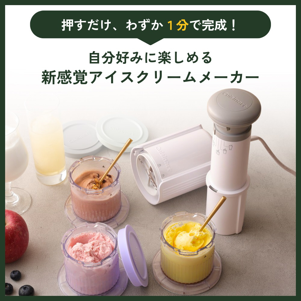 食べる直前に仕上げるアイスクリームメーカー(材料を予め冷凍しておき、食べる直前にかくはんして滑らかなデザートに)。わずか1分で仕上がるパワフルモーター搭載。操作は簡単、刃がついた本体のハンドル部分を上下に動かし、わずか1分で完成。アイスクリーム、シャーベット、ミックスイン、ミルクシェイク、スラッシーの5種が楽しめる。カップは3つ付属でお好みのデザートを種類を分けて作れる。収納しやすい組み立て式本体。スリムだから場所もとらない。