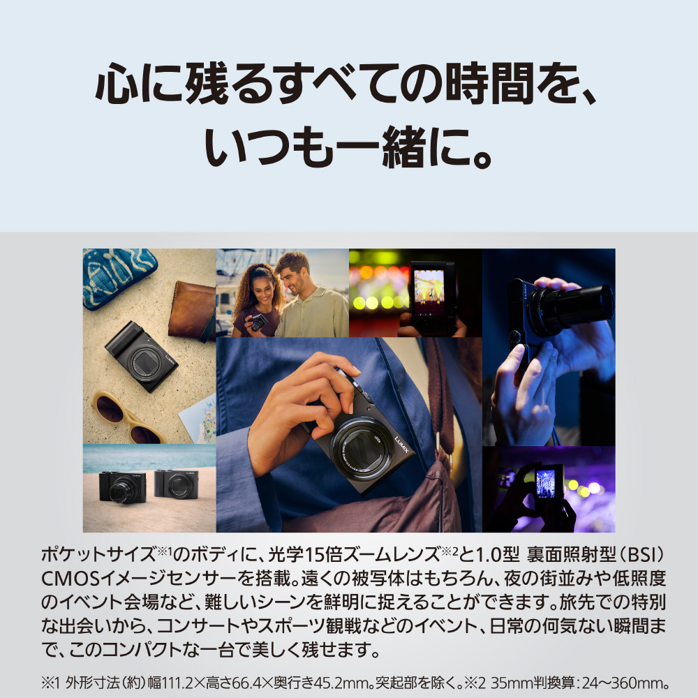 光学15倍ズーム(35mm判換算:24〜360mm)により、遠くの被写体も細部まで鮮明に捉えます。世界的に有名なLEICAの名を冠した高性能レンズを搭載し、広角24mmから望遠360mmまでの幅広い焦点距離をカバー。広大な風景も、近づけない被写体も、この一台でしっかり撮影できます。