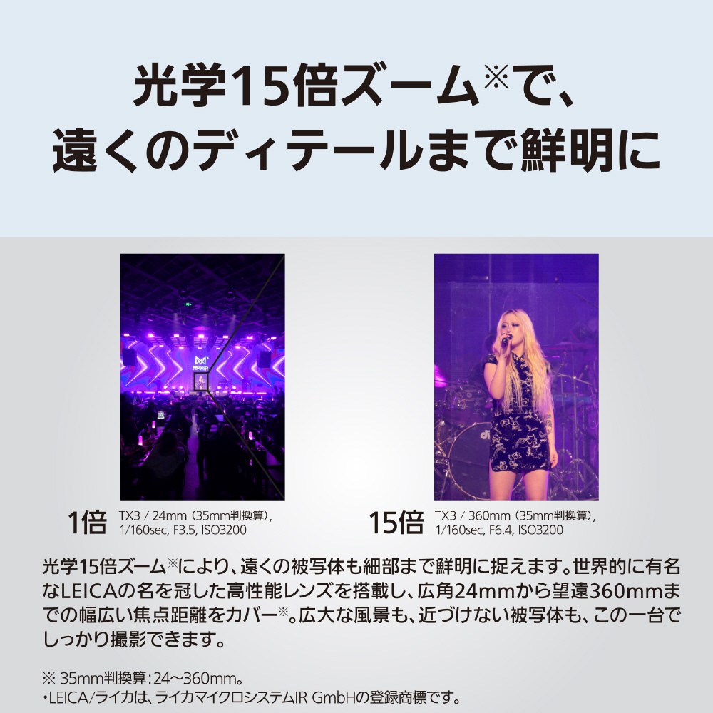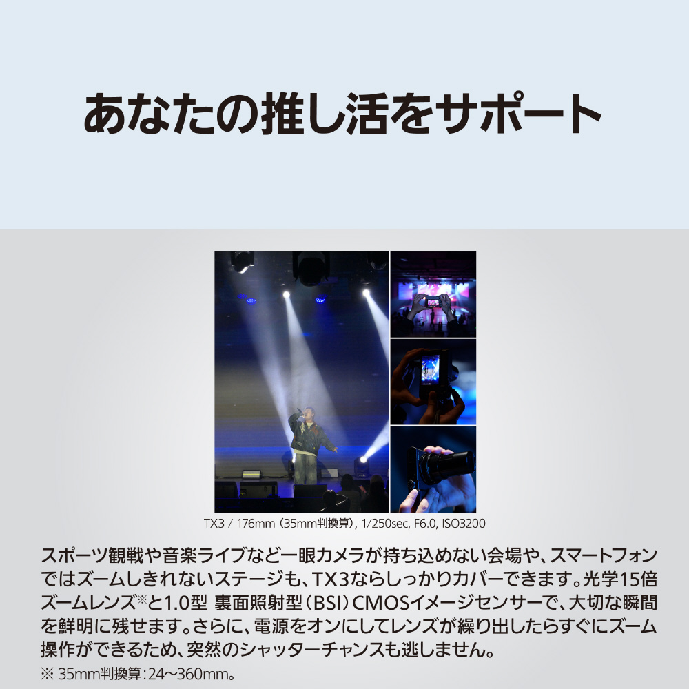 スポーツ観戦や音楽ライブなど一眼カメラが持ち込めない会場や、スマートフォンではズームしきれないステージも、TX3ならしっかりカバーできます。光学15倍ズームレンズと1.0型 裏面照射型(BSI)CMOSイメージセンサーで、大切な瞬間を鮮明に残せます。さらに、電源をオンにしてレンズが繰り出したらすぐにズーム操作ができるため、突然のシャッターチャンスも逃しません。