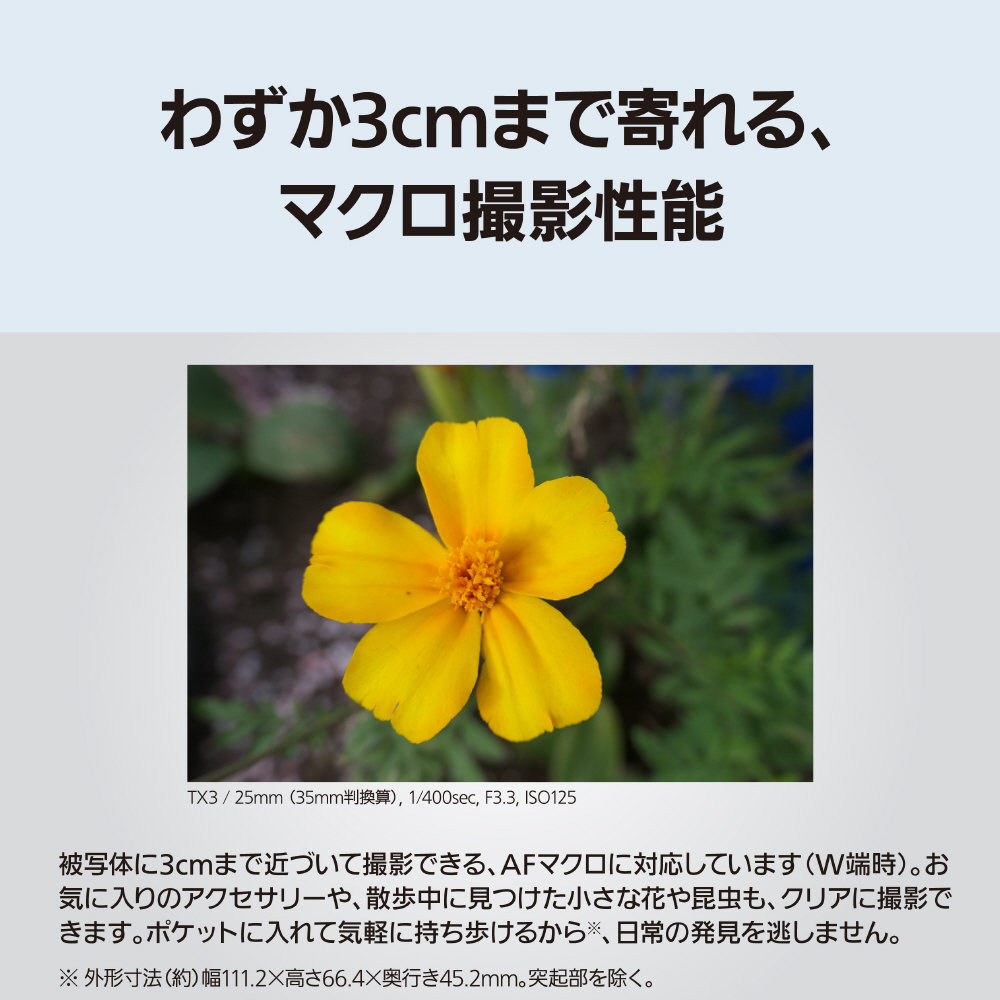 被写体に3cmまで近づいて撮影できる、AFマクロに対応しています(W端時)。お気に入りのアクセサリーや、散歩中に見つけた小さな花や昆虫も、クリアに撮影できます。ポケットに入れて気軽に持ち歩けるから※、日常の発見を逃しません。