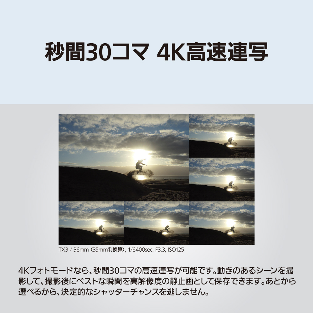 4Kフォトモードなら、秒間30コマの高速連写が可能です。動きのあるシーンを撮影して、撮影後にベストな瞬間を高解像度の静止画として保存できます。あとから選べるから、決定的なシャッターチャンスを逃しません。