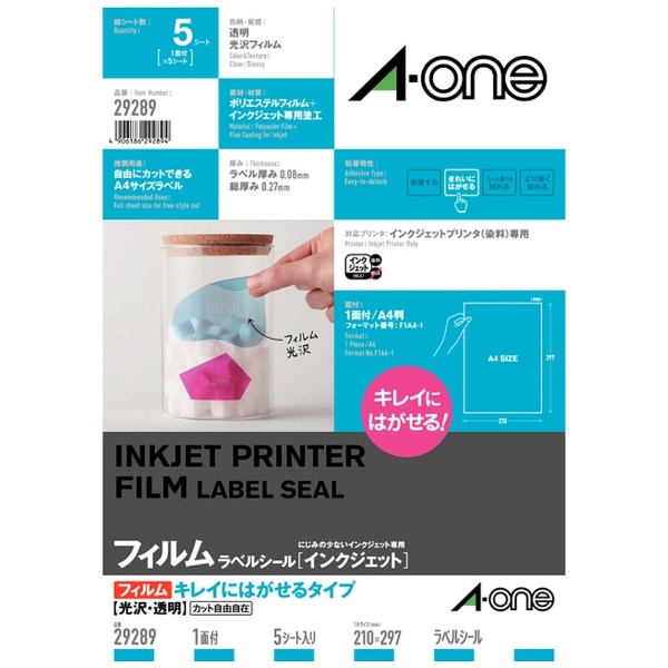29289 (インクジェットプリンタラベル 透明フィルム キレイにはがせるタイプ A4判 ノーカット/5シート )