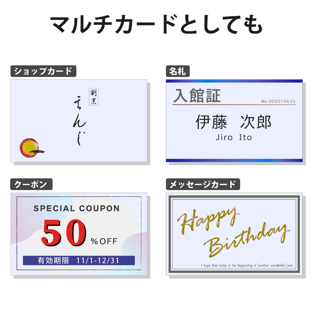 印字面は両面塗工仕様で、デジカメ画像などの写真付き名刺の作成に適します。名刺サイズにカットされたカット紙名刺です。プリンターにそのまま差し込んで印刷できます。