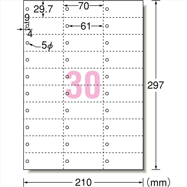 シートサイズ:A4判 (210×297mm)/一片サイズ:70mm×29.7mm/面付:30面 3列×10段/厚み:210g/u(0.23mm)