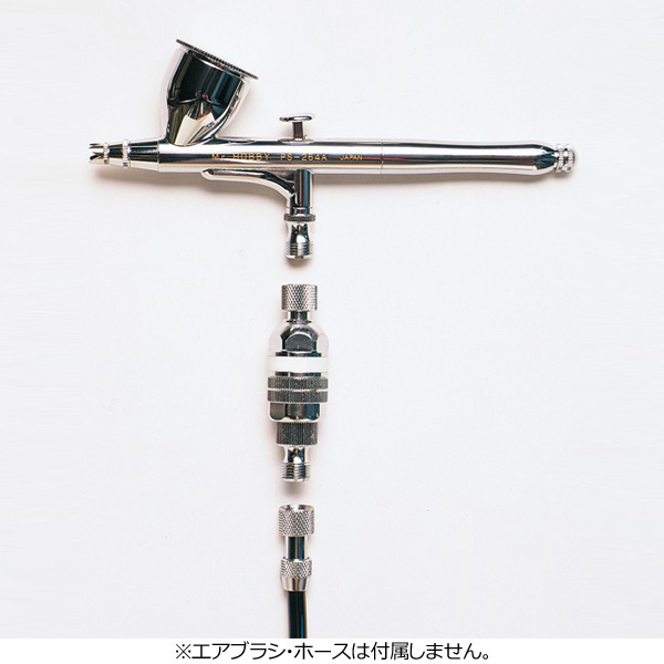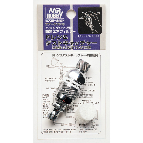 レギュレーターを使用していても、梅雨時になるとホース内に水滴が発生する場合があります。そのような時に、ドレン&ダストキャッチャーをエアブラシに繋ぐことで、水滴をほぼ完全にブロックします。エアブラシを握りやすくなる、ハンドグリップにもなります。