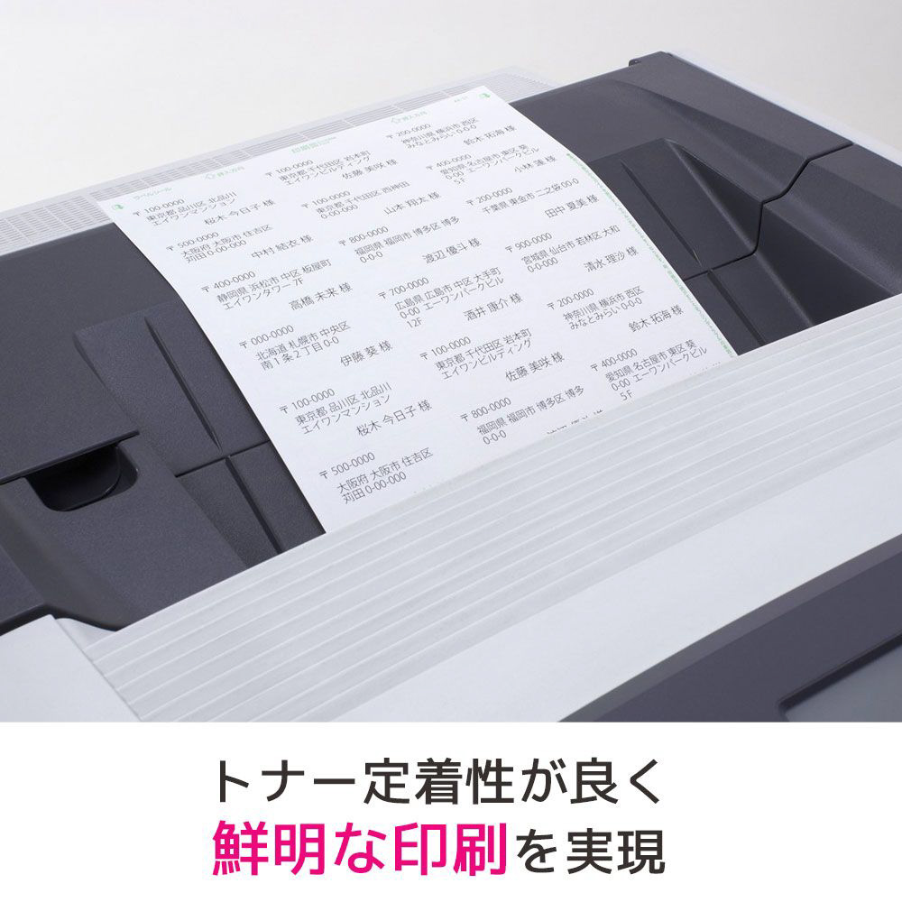 手間のかかる宛名や表示ラベルが手軽にキレイに作れます。特殊加工で抜群のトナー定着を実現。カラーレーザープリンタでも使用できます。入り数:100シート(2400片)。シートサイズ:B4判。素材:塗工紙。