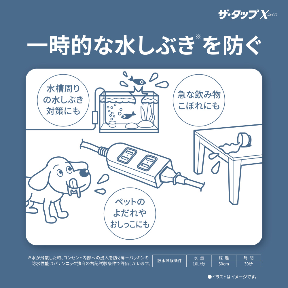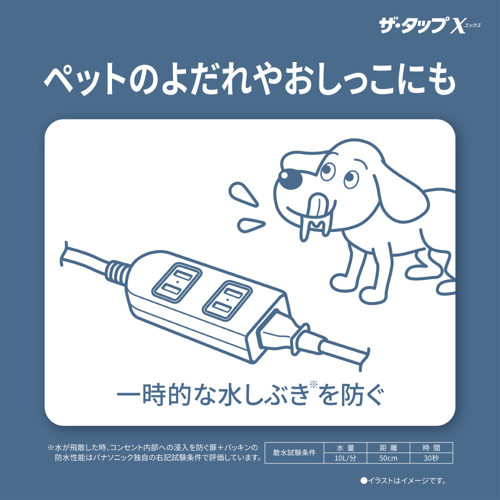 ■世界初(2006年1月12日発表。テーブルタップの中でナショナル社調べ)一時的な水しぶき・ホコリの侵入をガードする「防水扉(水が飛散した時、コンセント内部への浸入を防ぐ扉+パッキンの防水性能はナショナル社独自の試験条件で評価)」付。 ■内ボディにトラッキングに強い「ユリア樹脂」。外ボディにも「燃え広がりにくい樹脂」を採用した熱に強い二重ボディ。 ■高電導材の採用で発熱量を約24%ダウン。発熱を抑えた「新接続コンセント」です。 ■コード根元部折り曲げ強度(保証値)を従来品の2倍にアップ。コードも二重被ふく、栓刃間のユリア樹脂でトラッキング防止、また、はがれにくい極薄の絶縁被ふく付プラグで感電への不安を抑えます。