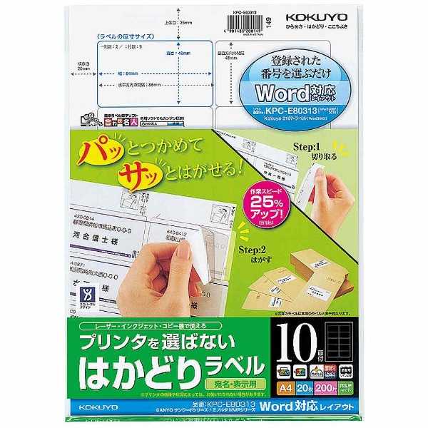 ●ラベル余白部と台紙に、ミシン目が入っており、切り取るとラベルのつかみしろが一気に現れる「はかどりカット」を採用。大量のラベルを効率よくはがせます。●レーザープリンタ・インクジェットプリンタ両対応なので、さまざまなプリンタで使えます。●ラベルの余白部には、斜め方向のカットが入っているため、1枚ずつラベルをはがす場合も楽にはがせます。