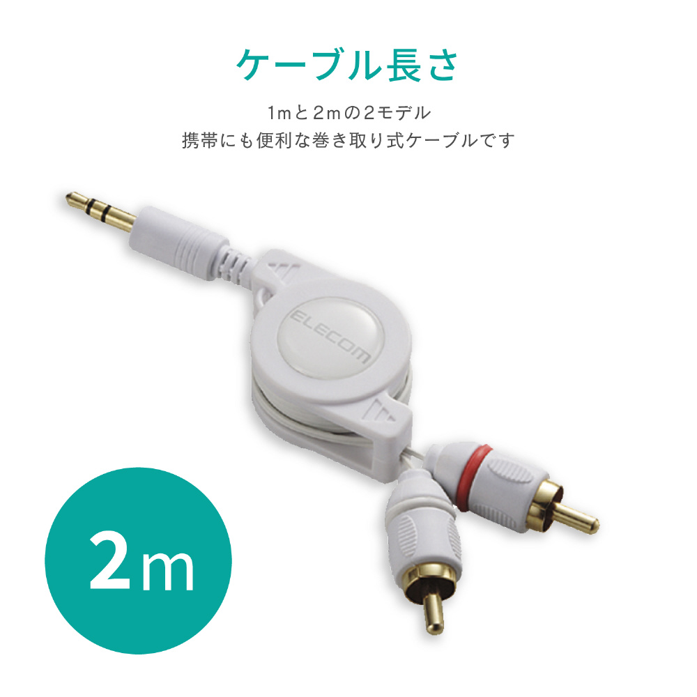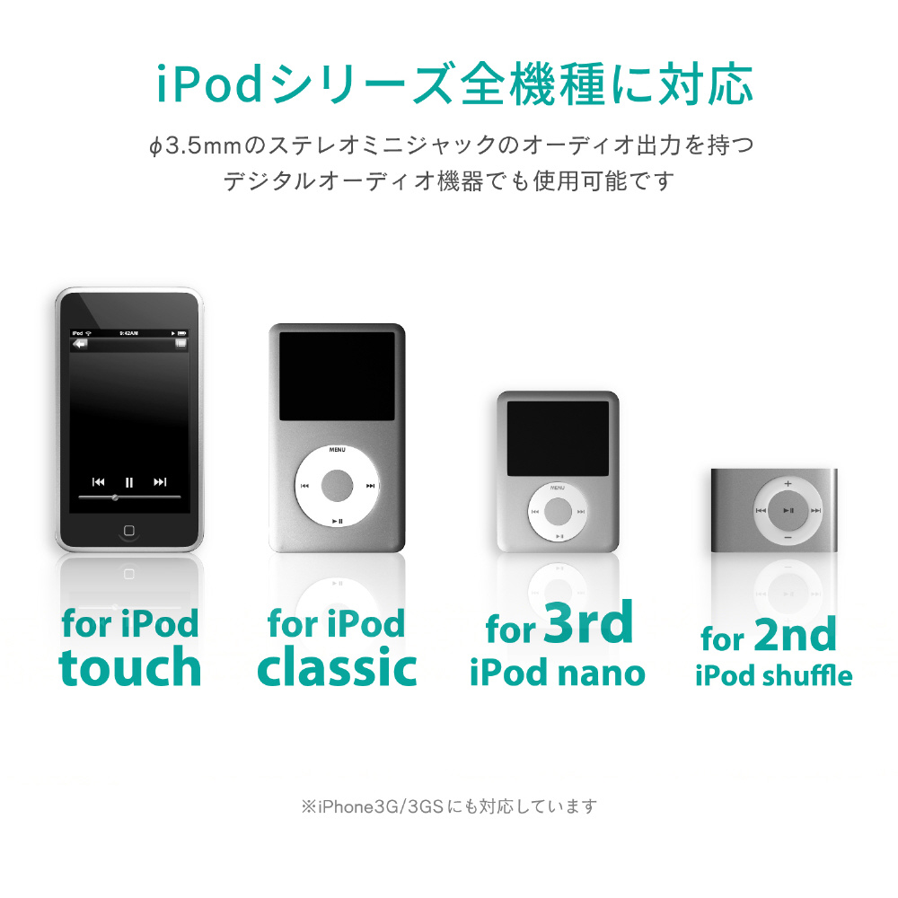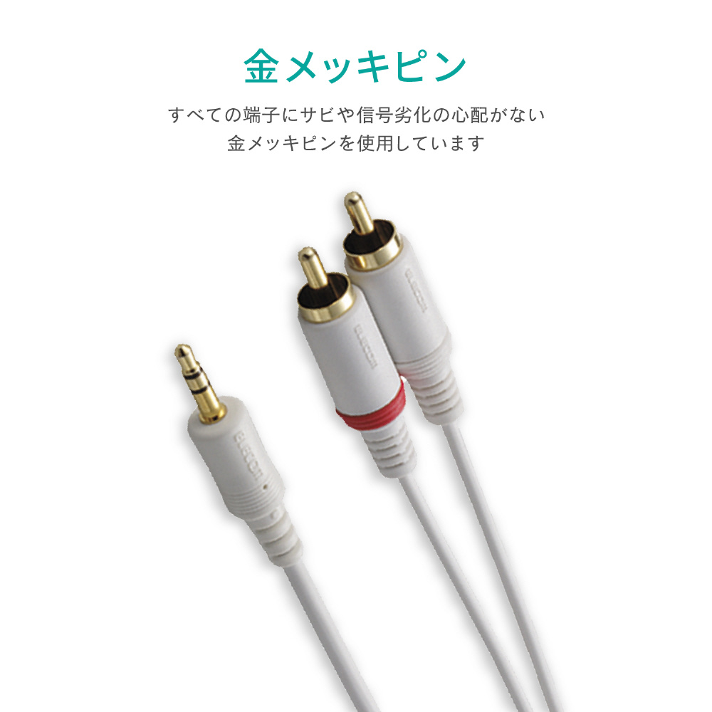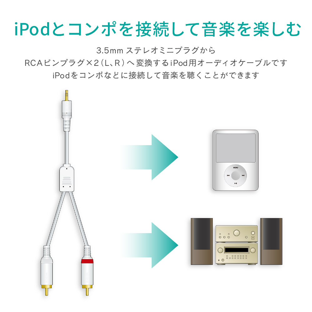 3.5mmステレオミニプラグからRCAピンプラグ×2(L、R)へ変換するiPod用オーディオケーブル。iPodとコンポを接続して音楽が楽しめます。