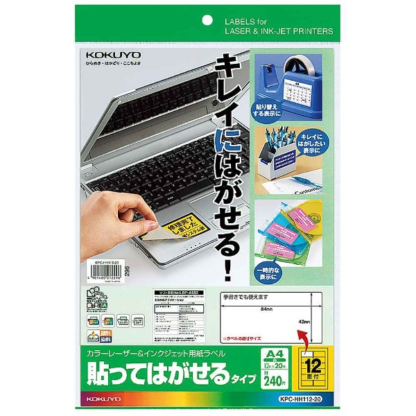 KPC-HH112-20(用紙/ラベル用/貼ってもはがせる/各種プリンタ対応/A4/1シート12面/20枚入)