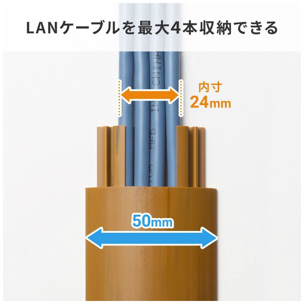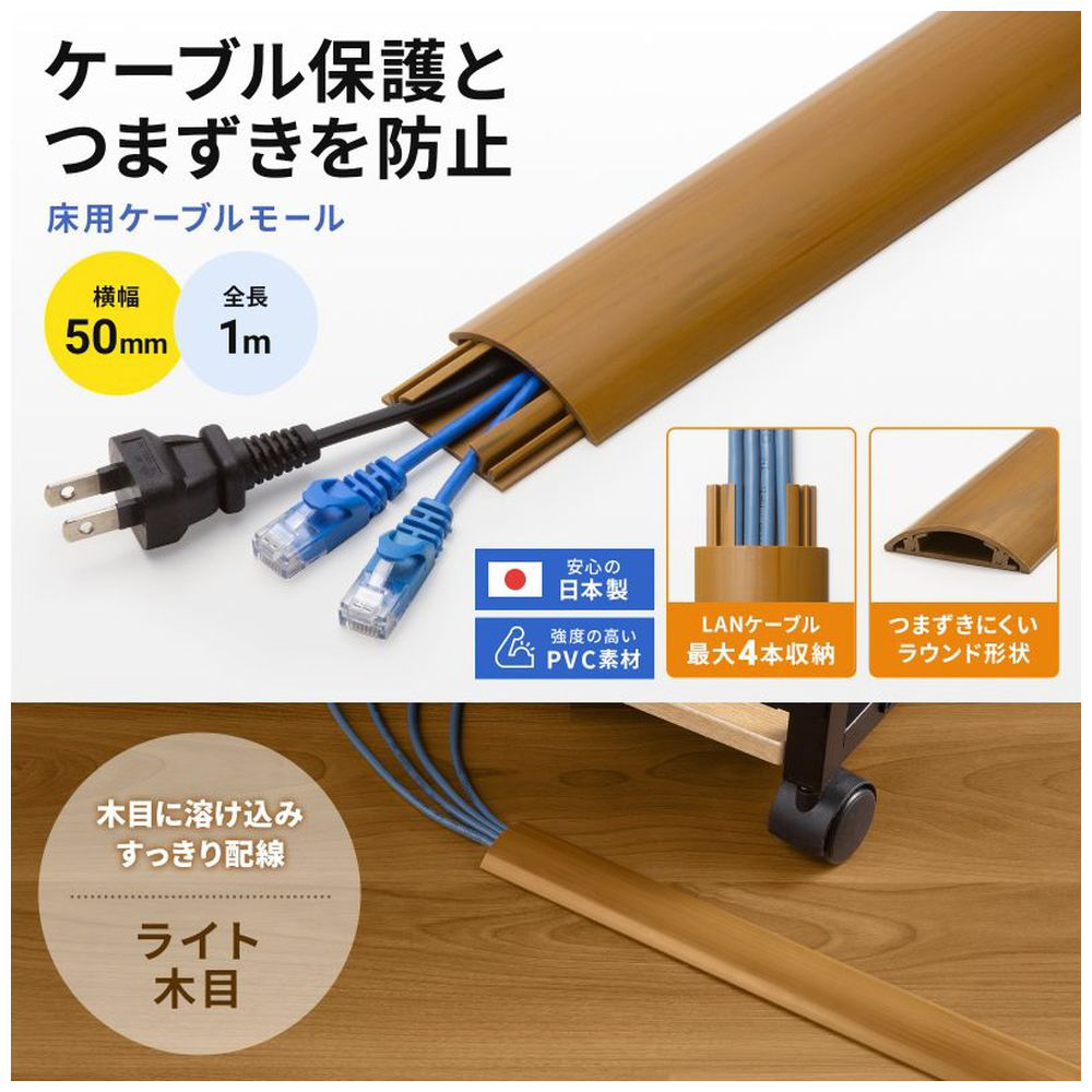 | 仕様1 | [ケーブル収容数] 4本 ※ケーブル収容数は、直径5〜6mmのLAN(UTP)ケーブルを収容した場合の目安です。 [カラー]木目 ※木目模様は製品毎に異なります。 [幅]50mm [全長]1m [サイズ] 外寸/W50×D1000×H12mm 内寸/W24×D1000×H8mm [重量]331g [材質]PVC [セット内容]本体×1 ※裏面に両面テープは付いていません。 |