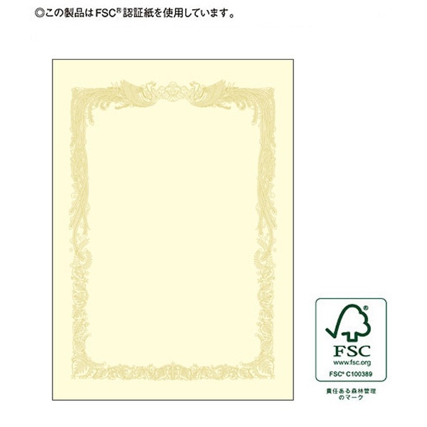 美しい金色の輝きを保つ特殊印刷をした賞状です。新たな印刷技法を用いているのでレーザープリンタやその他の出力機に対応しています。賞状用紙にふさわしい気品と深みのある風格が縁飾りに表現されています。従来からの手書きや通常印刷(凸版やオフセット)にも使用できます。高級感あふれるクリームタイプ。横書き用(縦型)です。業務用100枚仕立て。