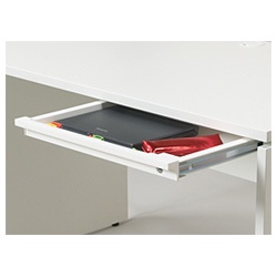 鍵付きの樹脂製引き出し。4本の木ねじでデスクの天板裏に固定します。幅550×奥行き500mmの、凹凸のない平面があれば取り付けられます。