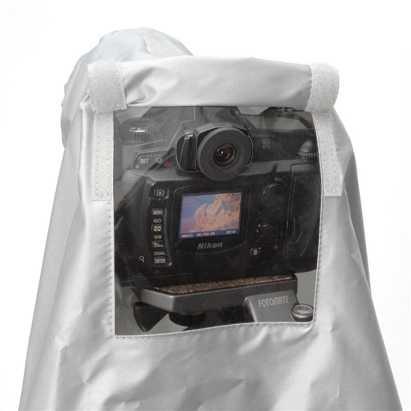 デジタル一眼レフカメラ用のレインカバーです。液晶用の透明窓が加わり、液晶画面の確認が容易になりました。光学ファインダー用のアイピース取付穴も付いているので、ファインダー像はクリアなまま。■レンズ部分の長さ:20cm