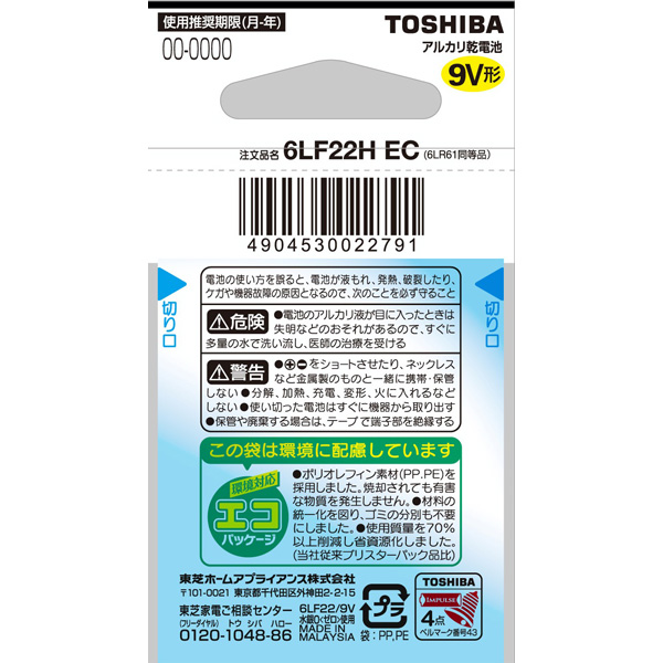 【9V形】6LF22HEC(インパルス/乾電池/アルカリ/角型/エコパッケージ/1本パック)