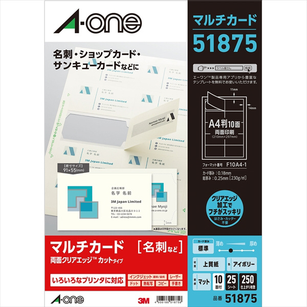 51875 マルチカード 各種プリンタ兼用紙(両面クリアエッジタイプ/アイボリー/A4判/10面/名刺サイズ) 【864】