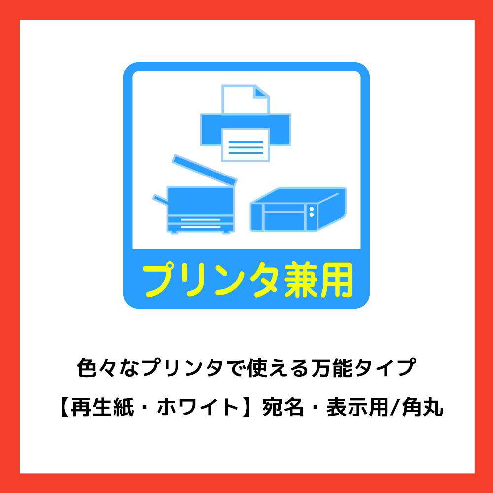 再生紙 ホワイト:四辺余白付・角丸。グリーン購入法の「文具類(タックラベル)」に定められている判断基準を満たしたラベル。