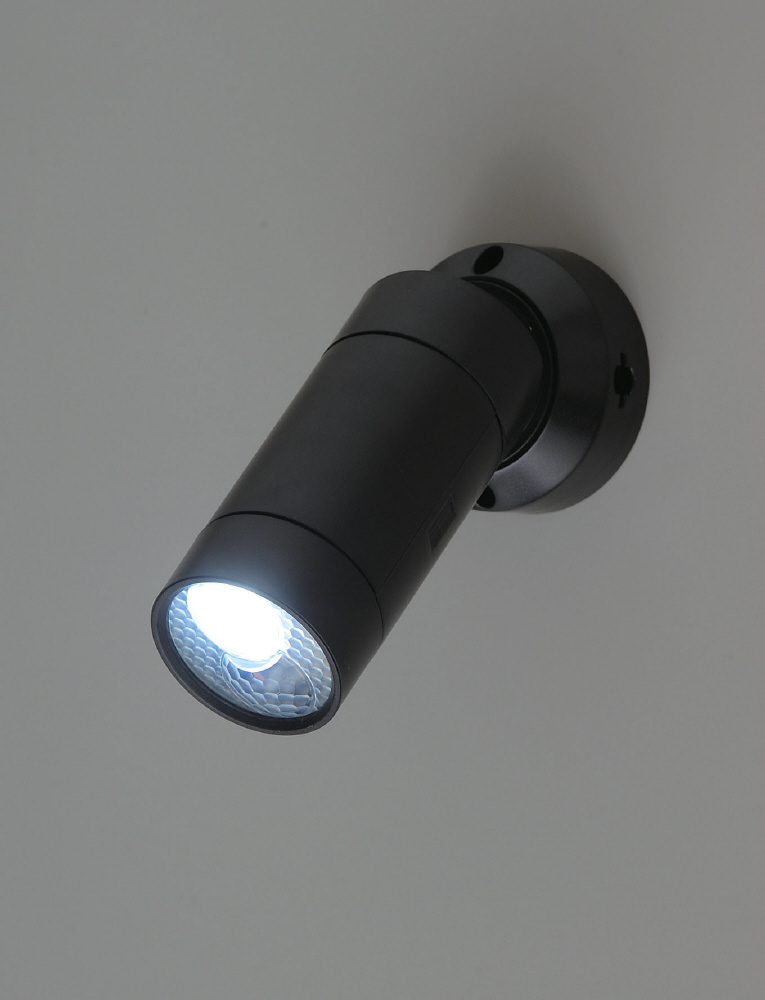 乾電池(単3X3本・別売)仕様でAC電源の無い場所に取り付け可能なセンサーライト。人感&明暗センサー搭載。屋外に設置可能な防雨構造。