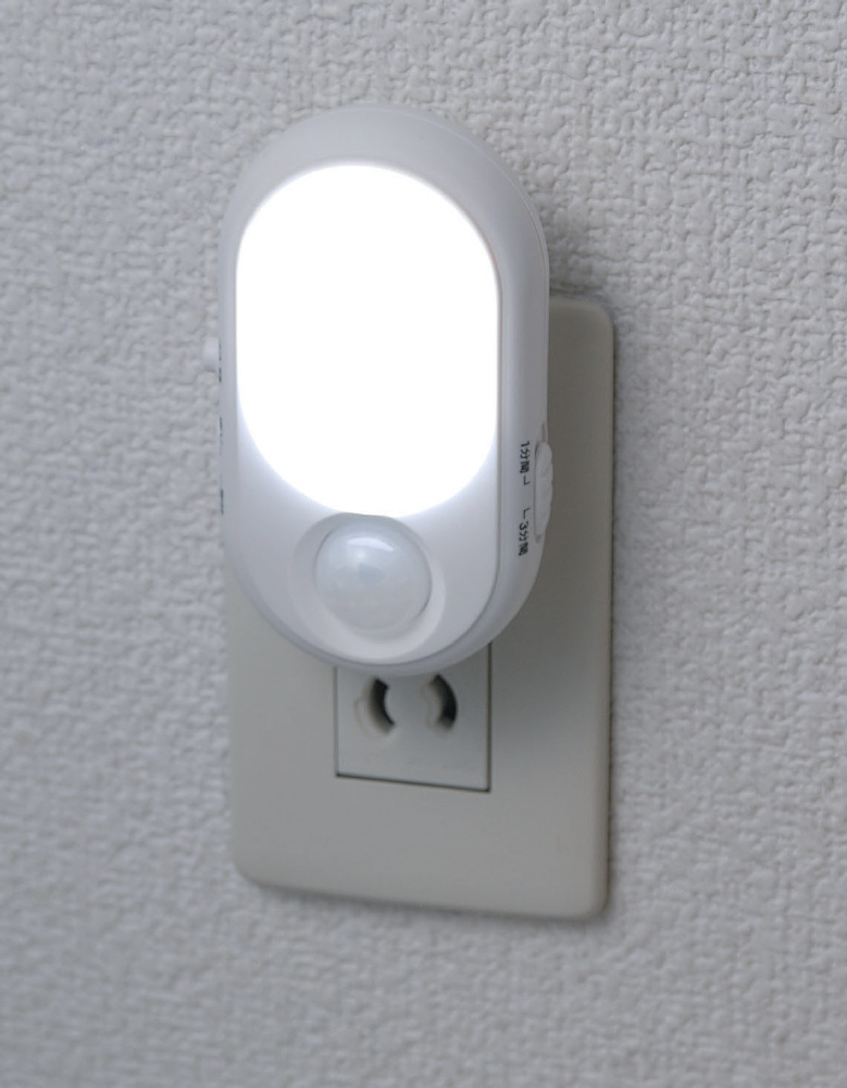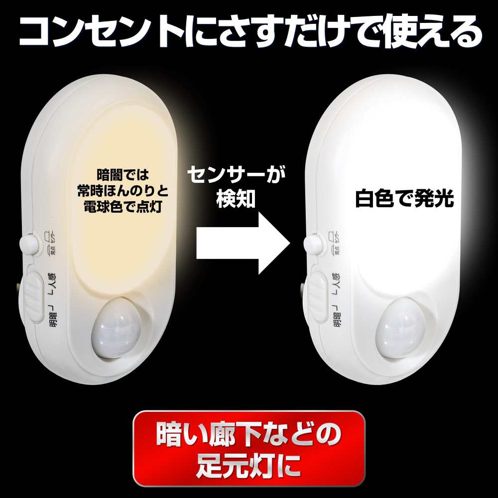コンセントに差し込むだけの簡単設置のLEDナイトライト。明暗センサーで暗くなると電球色でほんのり点灯。人が通ると自動的にしっかり白色に点灯。