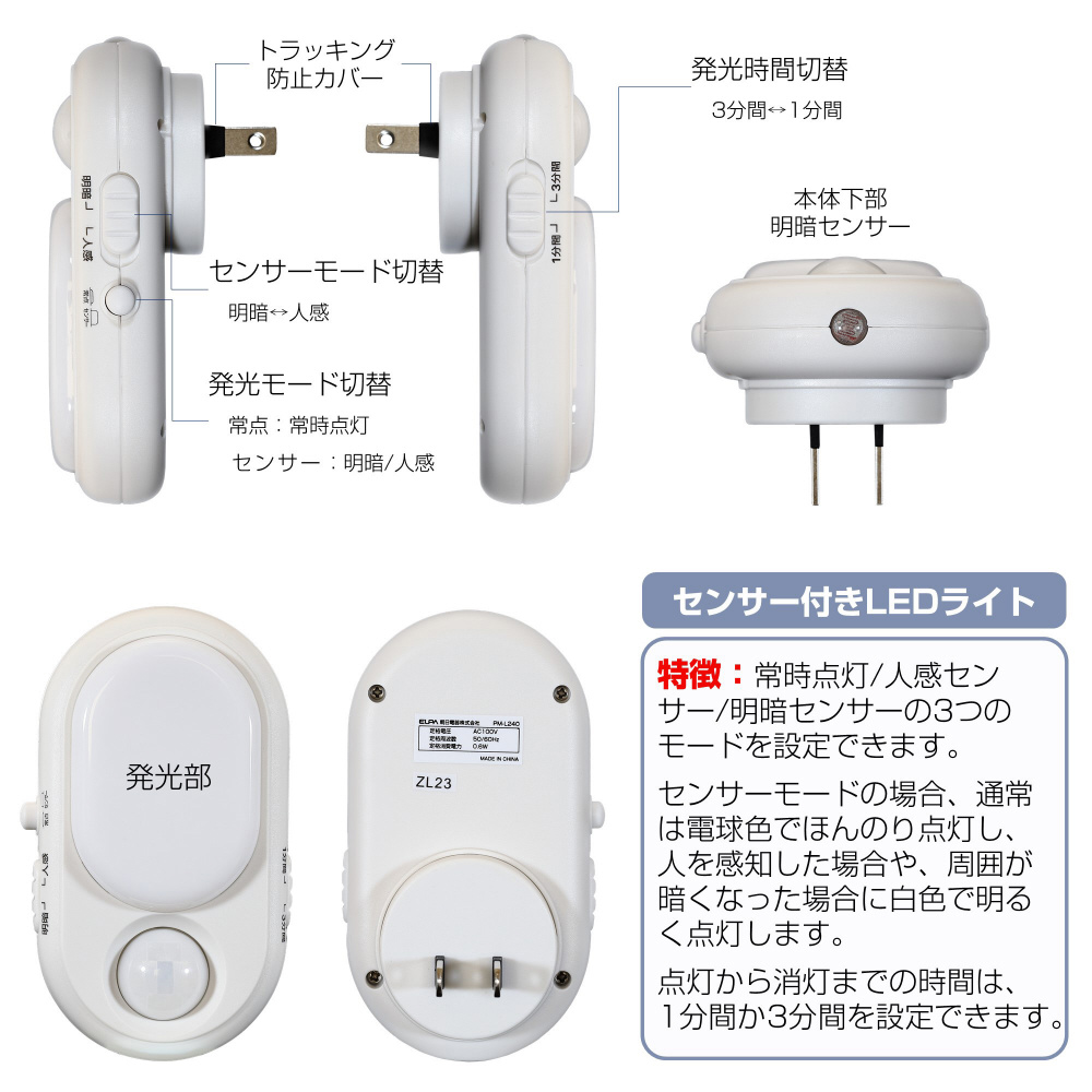 ■コンセントに差し込むだけの簡単設置のLEDナイトライト。■明暗センサーで暗くなると電球色でほんのり点灯。 人が通ると自動的にしっかり白色に点灯。の切替機能採用。■センサーモードと常点灯のモード変更付き。■安全・安心の耐トラッキングカバー付き。
