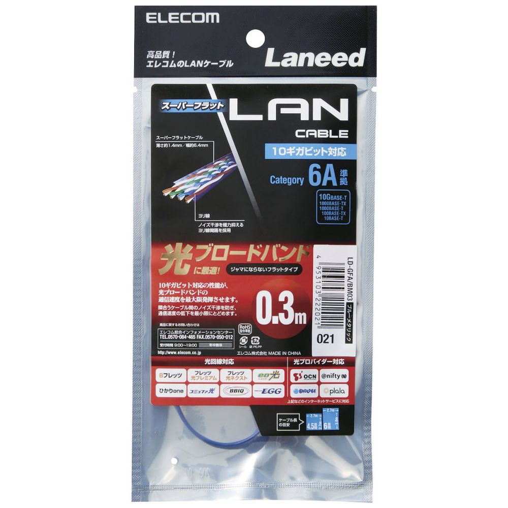 LD-GFA/BM03(カテゴリ6A スーパーフラットLANケーブル/ストレート/ブルーメタリック/0.3m) 【864】