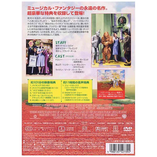 | 特典・特徴 | ●映像特典:メイキング/オリジナル劇場予告編/“オズ”の歴史/“オズ”のその後/スチール・コレクション&ドキュメンタリー映像集/未公開シーン集/音声特典(ジュークボックス/MGMラジオ・ショー/MGMラジオ・コマーシャル) |