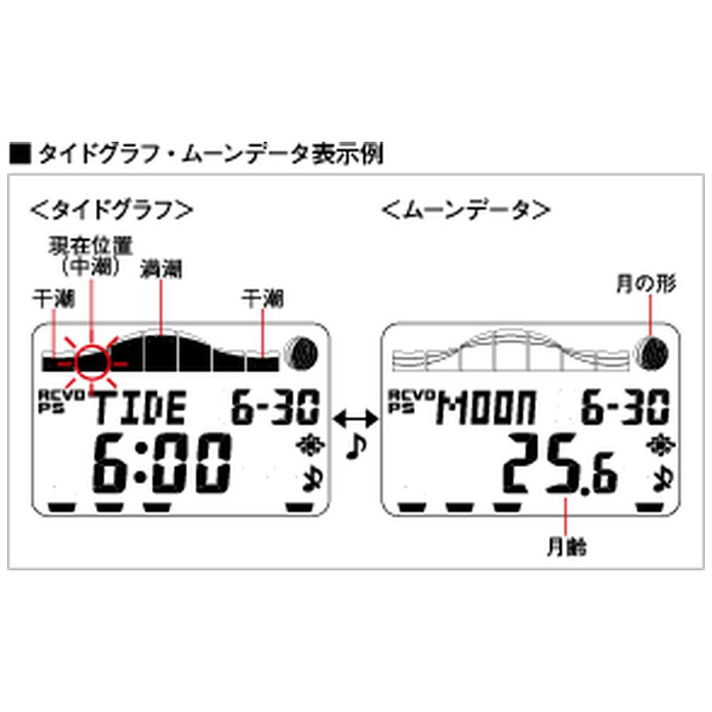| 仕様3 | 【その他機能】ムーンデータ(月齢・月の形表示)、タイドグラフ(潮回り:3段階表示、世界の100ポイントの潮汐データをプリセット)、フルオートカレンダー、12/24時間制表示切替、操作音ON/OFF切替機能 |