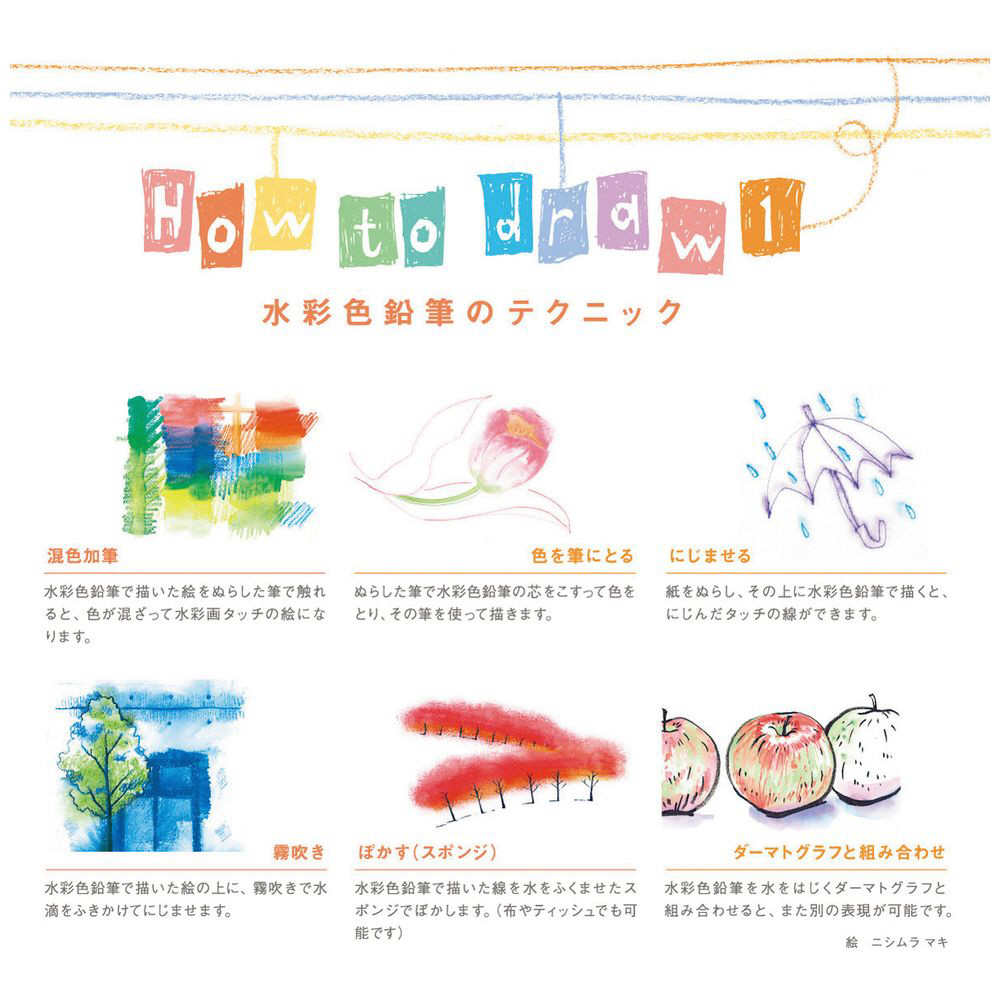 なめらかな色鉛筆のタッチ。水で溶かして水彩タッチ。手軽に水彩タッチが楽しめる水彩色鉛筆です。