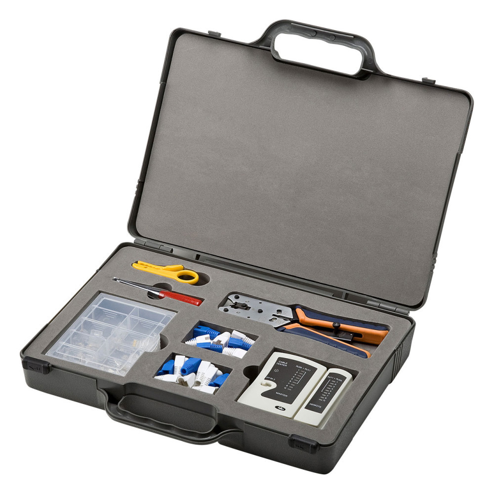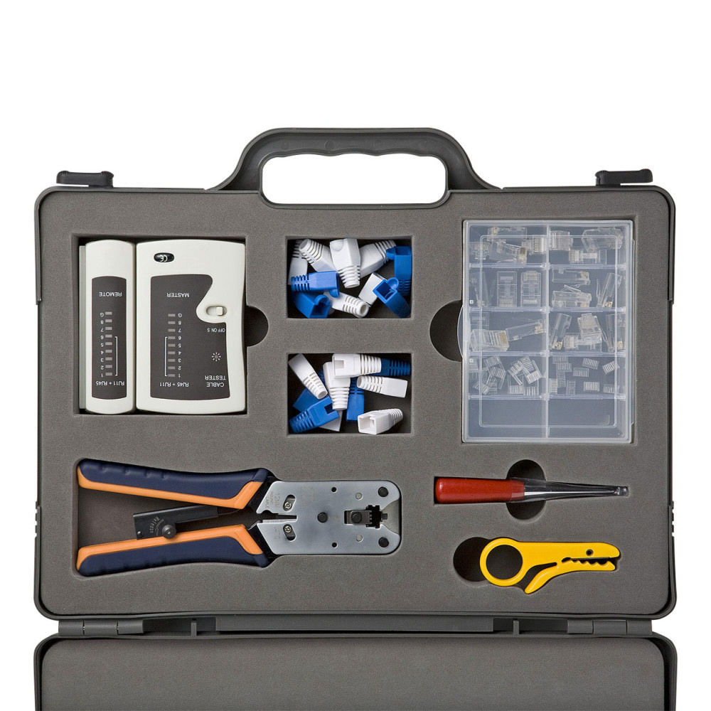 LANケーブル自作の必需品、工具、コネクタ、テスターをコンパクトにまとめたセット。