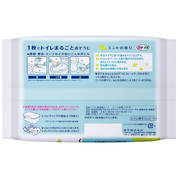 1枚で便器から床まで汚れをスッキリ落とし、除菌もできるおそうじシートです。ふわっと厚手のシートなので、汚れが手につく心配なく、安心しておそうじできます。ミントの香りで、気になる尿ハネのニオイまでスッキリ消臭。使用後はそのままトイレに流せます。温水洗浄便座にも使えます。