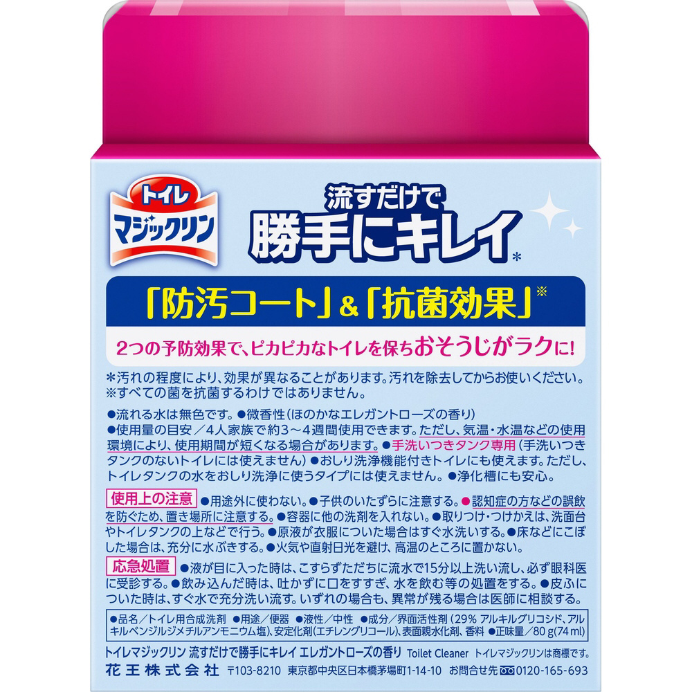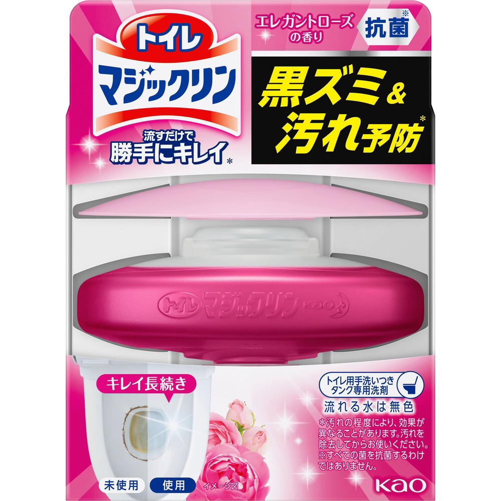 洗浄と抗菌のW効果!流すたび汚れをしっかり落とすのはもちろん、水たまりのまわりの黒ずみや、イヤなニオイの原因にもなる、菌の繁殖まで抑えて、いつもピカピカなトイレを保ちます。ほのかなローズせっけんの香りです。抗菌成分配合。流れる水は無色です。