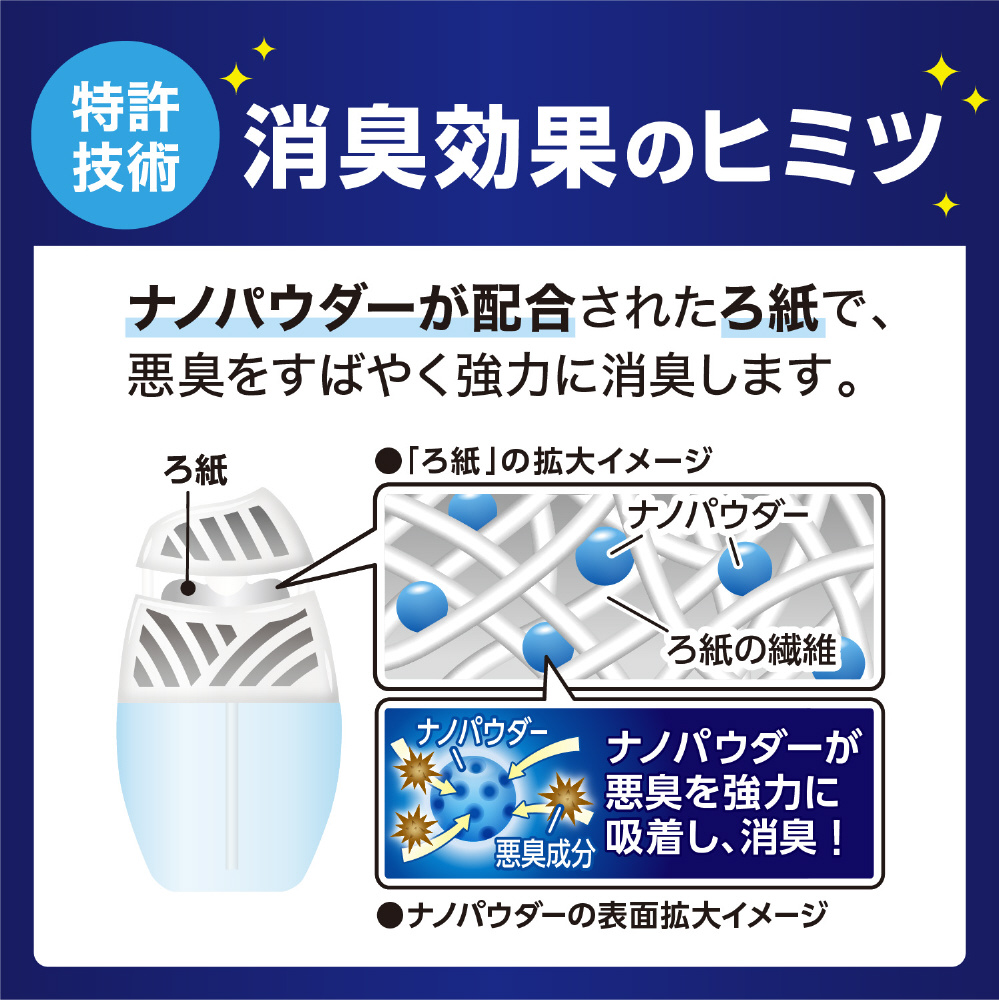 ナノパウダー配合で、すばやく強力に空間を消臭。消臭された空間に、香りがしっかり広がります。ラベルフィルムをはがせば、すっきりデザイン。お好みで下部フィルムデザインも残せます。香りや効果の強さが調節できます。香りや効果は通常約2〜3ヵ月持続します(使用状況により異なります)。