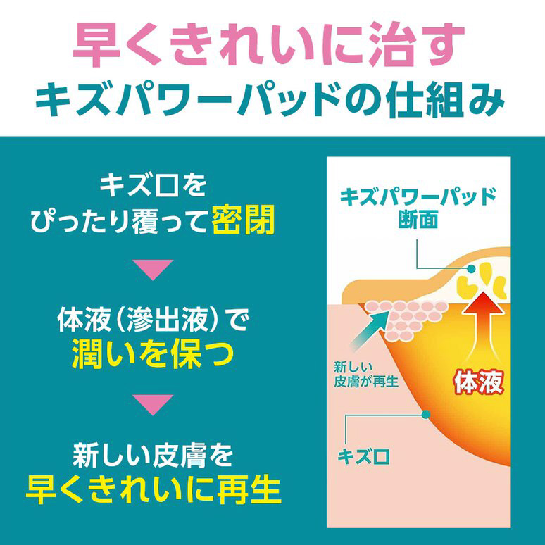 先端医療テクノロジーで開発されたキズパワーパッドは、自然治癒力を高め、痛みをやわらげながら、キズを早く治します。日本で初めて、効能として「治癒の促進」が認められた救急医療用具です。滅菌済。【効能・効果】切り傷、すり傷、さし傷、かき傷、靴ずれ等の創傷及び軽度の熱傷の「治癒の促進」、「痛みの軽減」、「湿潤環境の維持」、「保護」