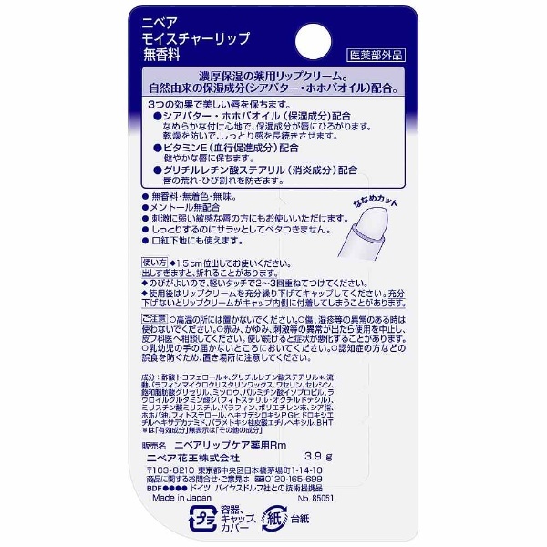 濃厚保湿の薬用リップクリーム。3つの効果で美しい唇に保ちます。●自然由来の保湿成分(シアバター・ホホバオイル)配合。なめらかな付け心地で保湿成分が唇にひろがります。乾燥を防いでしっとり感を長続きさせます。●ビタミンE(血行促進成分)配合。健やかな唇に保ちます。●グリチルレチン酸ステアリル(消炎成分)配合。唇の荒れ・ひび割れを防ぎます。無香料・無着色・無味。【医薬部外品】