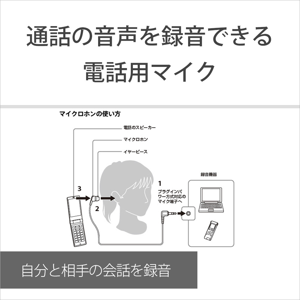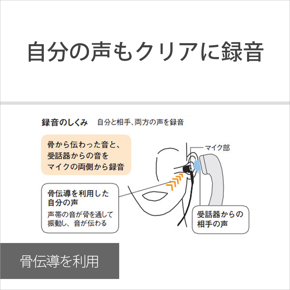 携帯電話や固定電話で相手の声と自分の声が録音できる。快適な装着感の電話用マイク