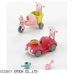 赤ちゃん用のカーゴ付き三輪車とくるまに、小物がついたセットだよ♪