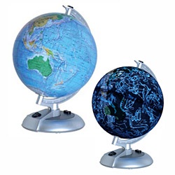 明るい室内では地球儀、部屋を暗くするとセンサーで光る天球儀になる、1台2役の地球儀です