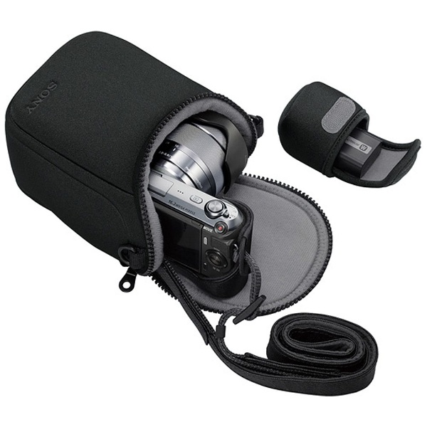 ハンドストラップやショルダーストラップを付けた状態で丁度良い感じに収まります。NEX-6やNEX-7では小さいかなと思います。