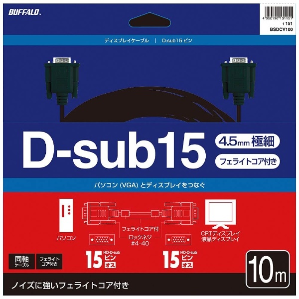 10m[HD-D-sub15pin ⇔ HD-D-sub15pin] ディスプレイケーブル 極細タイプ/フェライトコア付き ブラック BSDCV100BK [EU RoHS指令準拠]